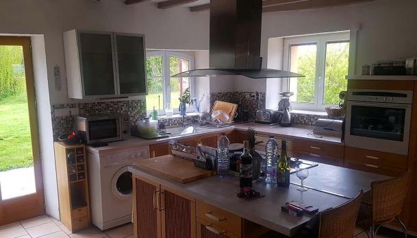 - Cuisine toute équipée de 20 m² avec îlot central, séparée de l’espace de vie par un colombage ancien.