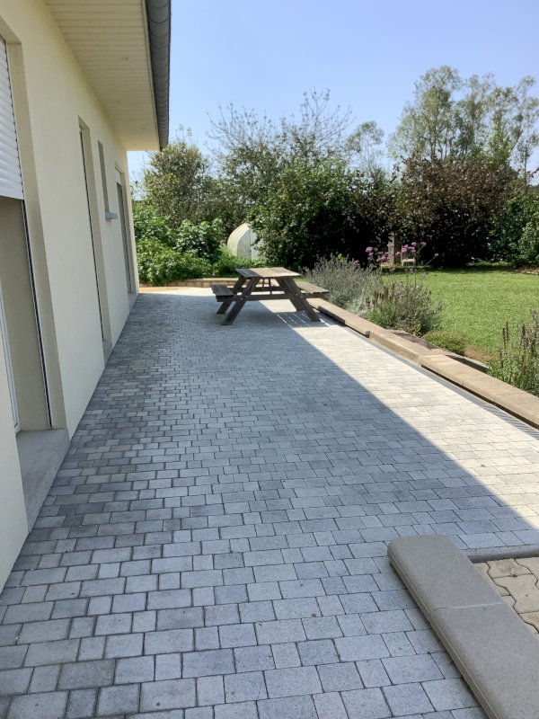 Trois terrasses dont une pavée, une cour pour 5/6 voitures, un jardin avec une serre tunnel de 24 m², un verger servant de parcours pour mes poules, une mare.
