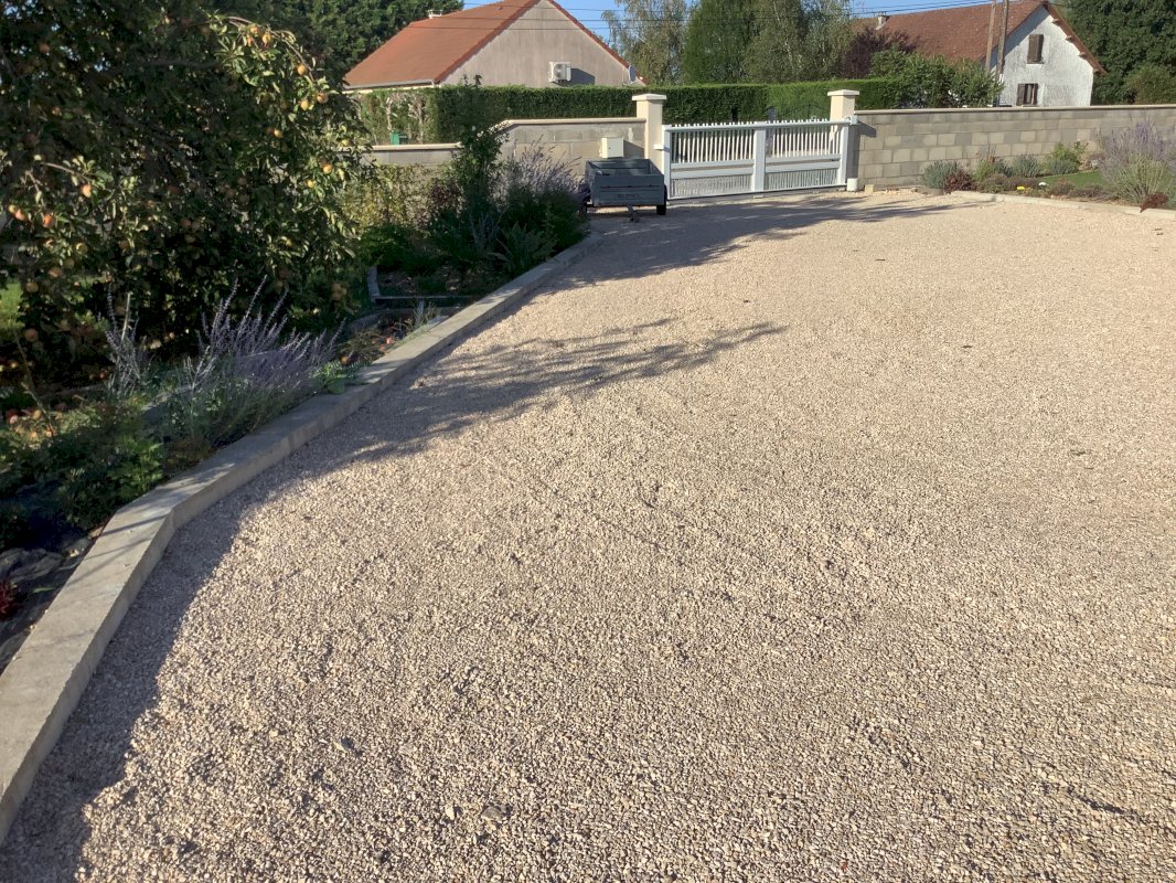Trois terrasses dont une pavée, une cour pour 5/6 voitures, un jardin avec une serre tunnel de 24 m², un verger servant de parcours pour mes poules, une mare.