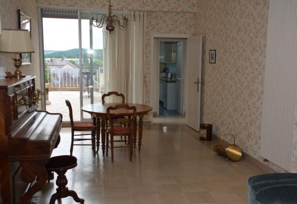 A la suite, une cuisine et une salle à manger de 20 m² avec cheminée en pierre, vue donnant sur jardin et coteaux ; dans sa partie supérieure, un grenier de même surface avec charpente en chêne apparente.