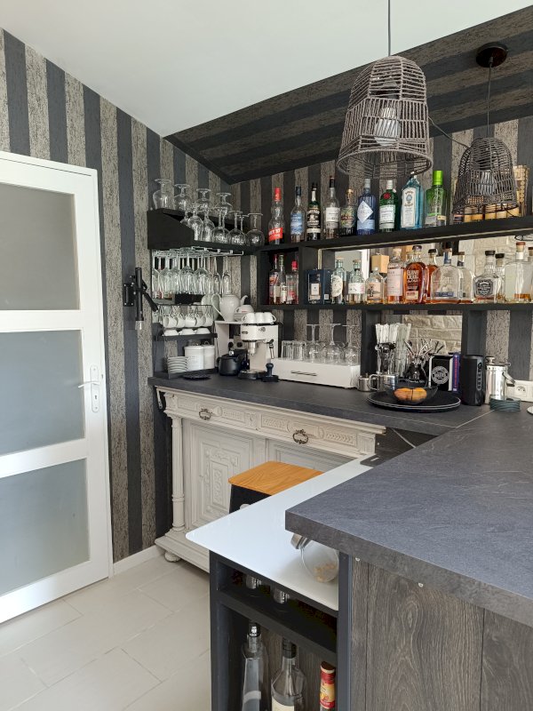 - D’un premier niveau d’environ 80m² composés d’une cuisine, salon, salle à manger, un bureau (ou chambre), un bar, une buanderie et une salle de douche.