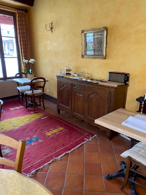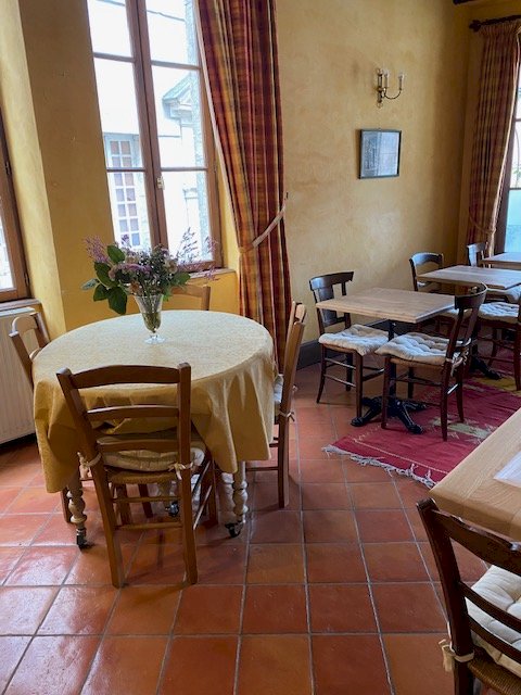 Dès les beaux jours, les invités peuvent profiter de la terrasse fleurie et ombragée, située sur la place de l'église et des halles du XIVe siècle.