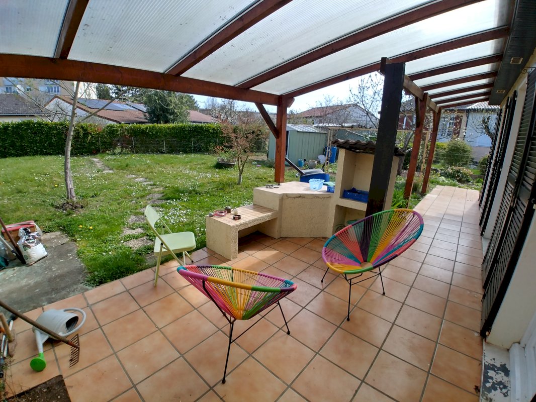 Terrain arboré, avec un coin terrasse abrité.
