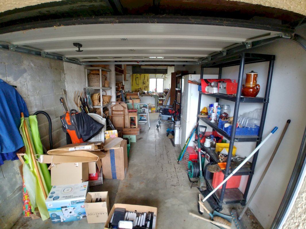 Un garage de 19 m², avec porte sectionnelle électrique, pouvant accueillir une voiture et un atelier.