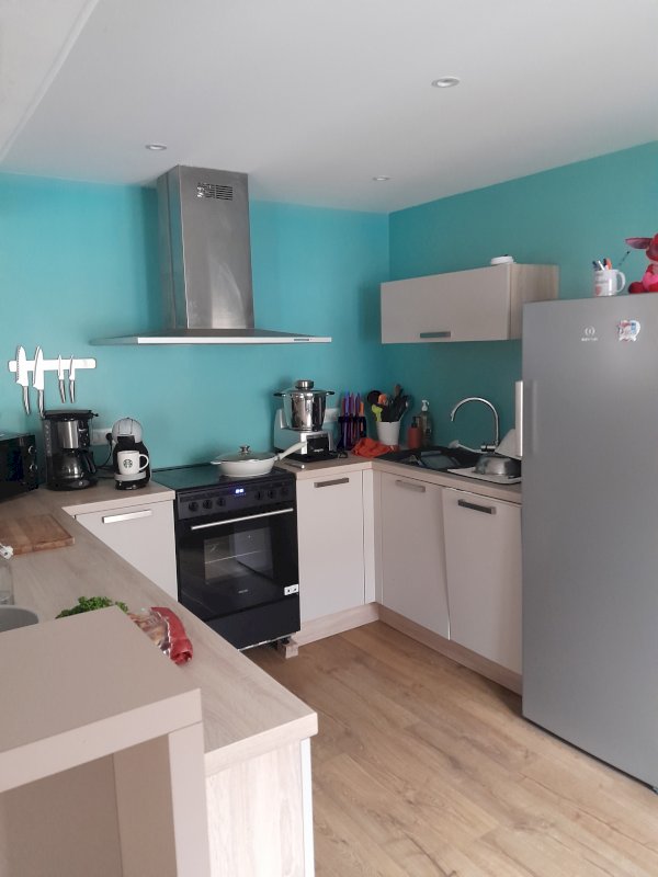 1 cuisine équipée avec hotte neuve , un grand salon salle à manger.