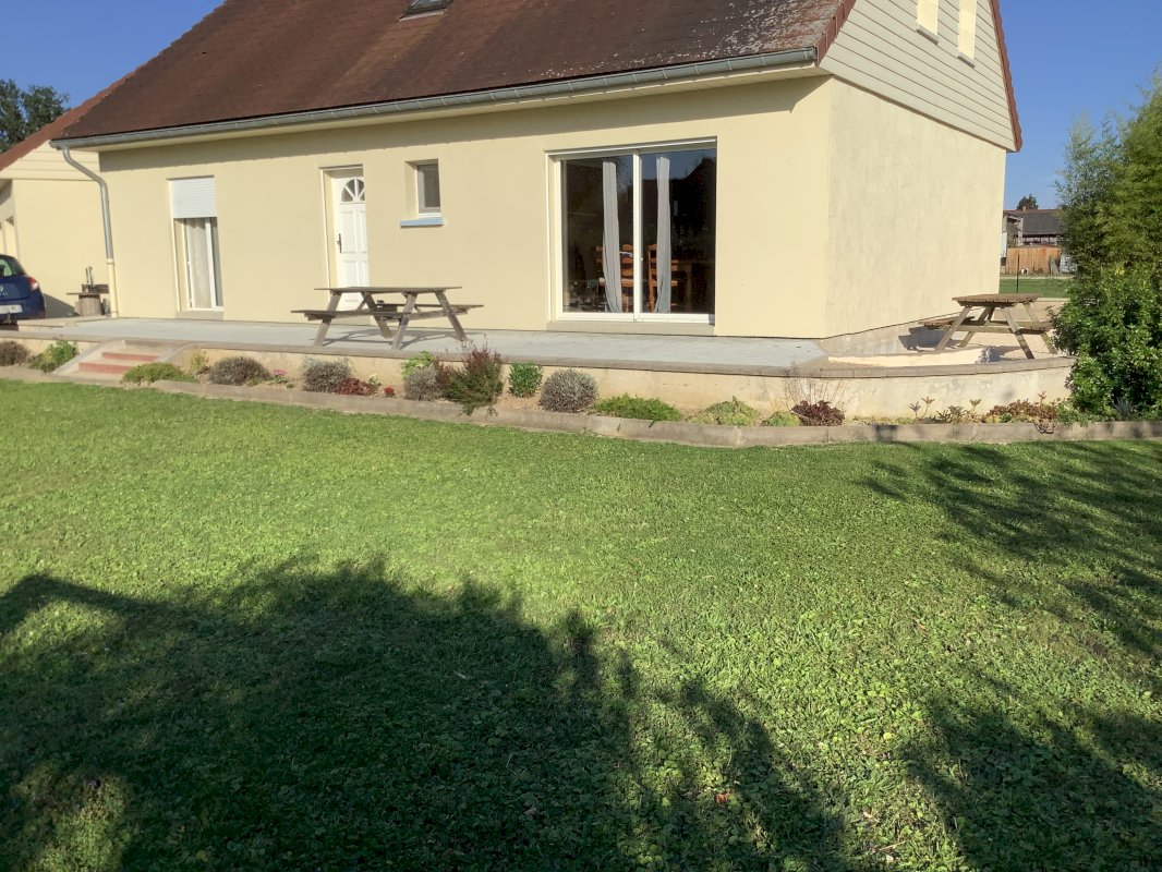 Trois terrasses dont une pavée, une cour pour 5/6 voitures, un jardin avec une serre tunnel de 24 m², un verger servant de parcours pour mes poules, une mare.