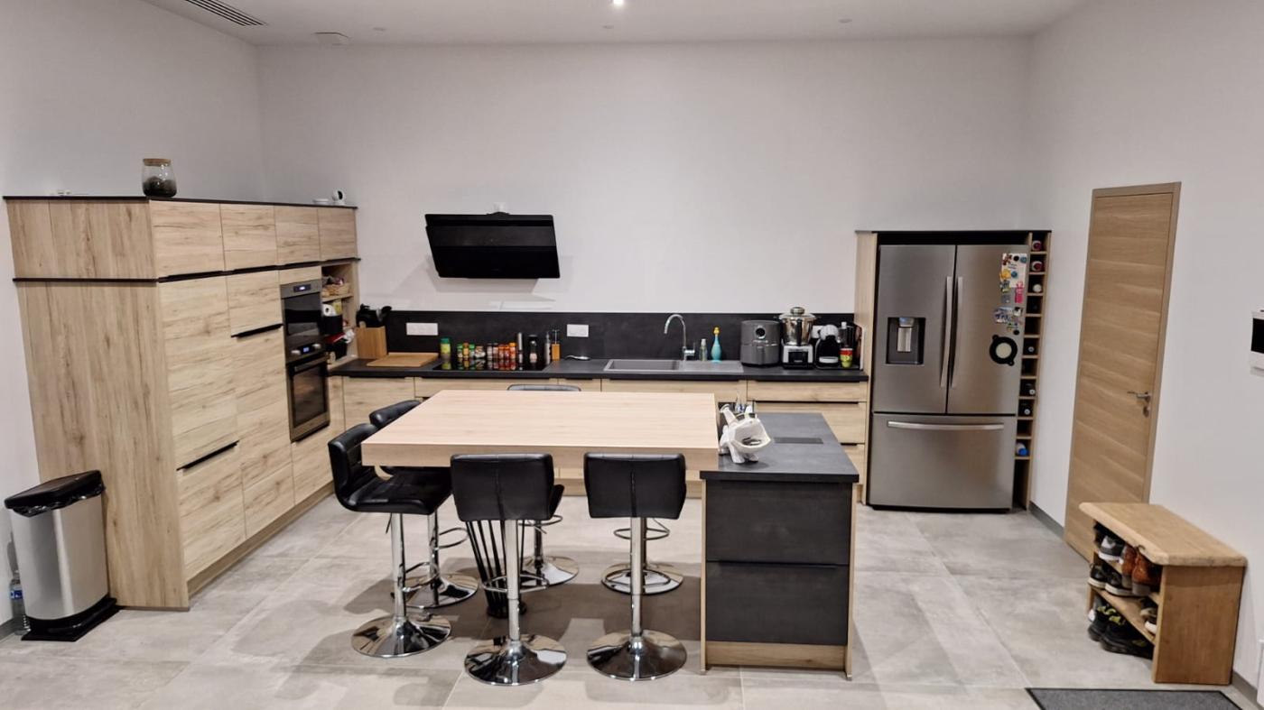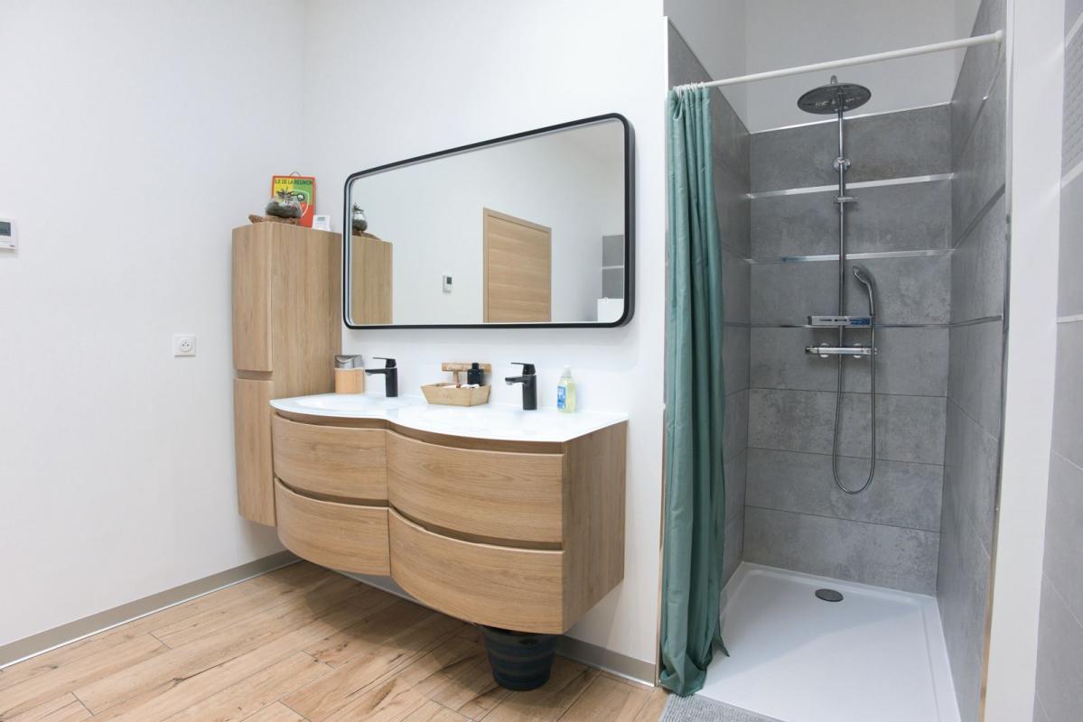 Elle se compose de la manière suivante : Un grand salon / salle à manger traversant de 96 m² avec cuisine ouverte entièrement équipée. Côté cuisine, un espace buanderie complète la pièce. Une grande salle de bains avec double vasques, baignoire balnéo et douche italienne. Ce bien comporte 4 chambres dont 3 avec porte-fenêtre et 1 avec fenêtre et puit de lumière. Une première chambre avec accès direct à un patio, une deuxième chambre (chambre parentale) donnant également accès au patio, et communiquant avec une salle d’eau partagée avec la troisième chambre. Enfin, une quatrième chambre dispose également d’un accès direct sur la terrasse à l’avant de la maison. Un WC séparé.