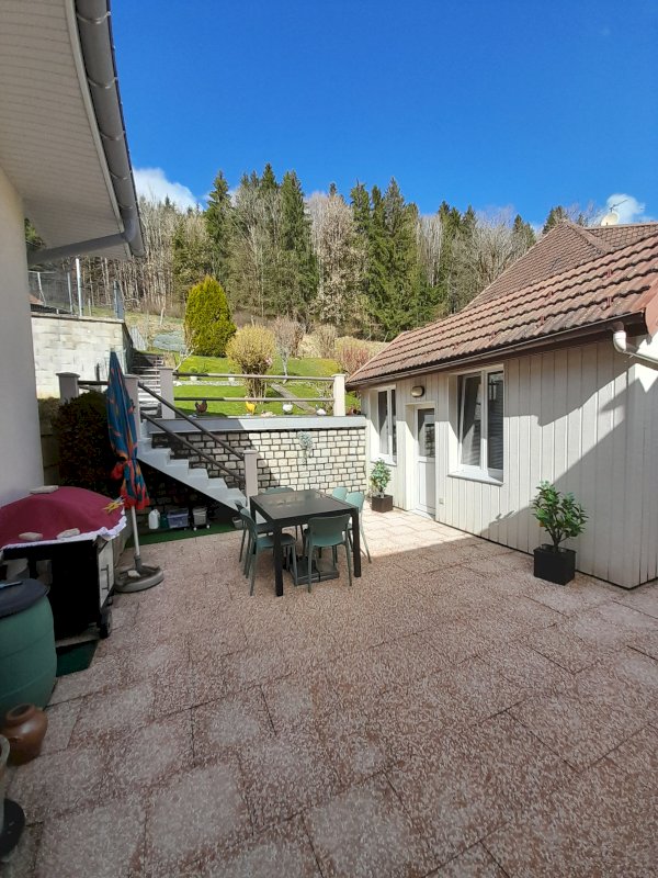 A vendre proche de Morteau et de ses commodités : maison de 86,17 m² avec terrasse de 44 m², cabane de jardin aménagées et du terrain 385 m².