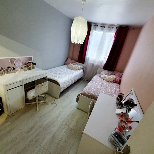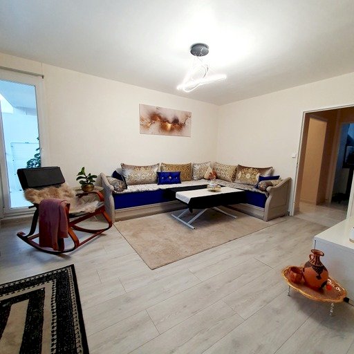 L'appartement se compose comme suite : 2 chambres + salon et séjour (séparé par un paravent pour une 3ème chambre). Une cave de 7 m² est un plus pour le rangement.