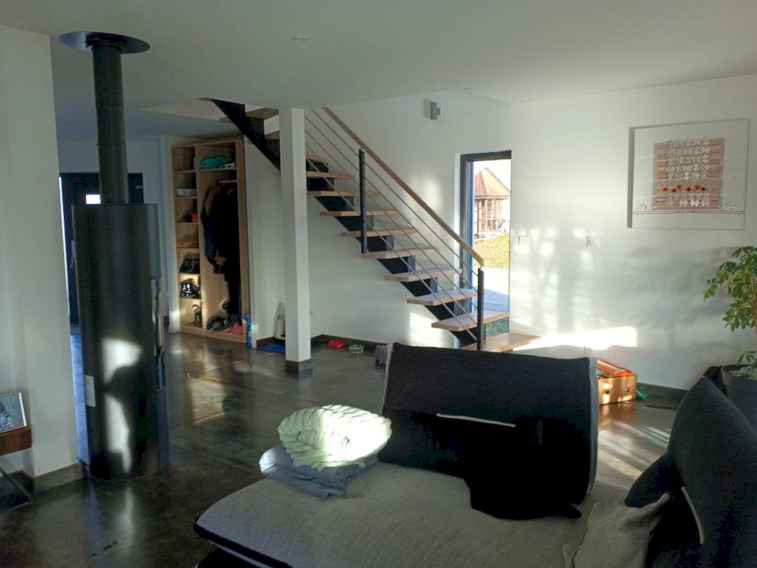 Au rez de chaussée, vaste pièce à vivre de 59m², très lumineuse avec des baies vitrées, volets électriques et BSO, cuisine équipée moderne ouverte sur un salon séjour spacieux.