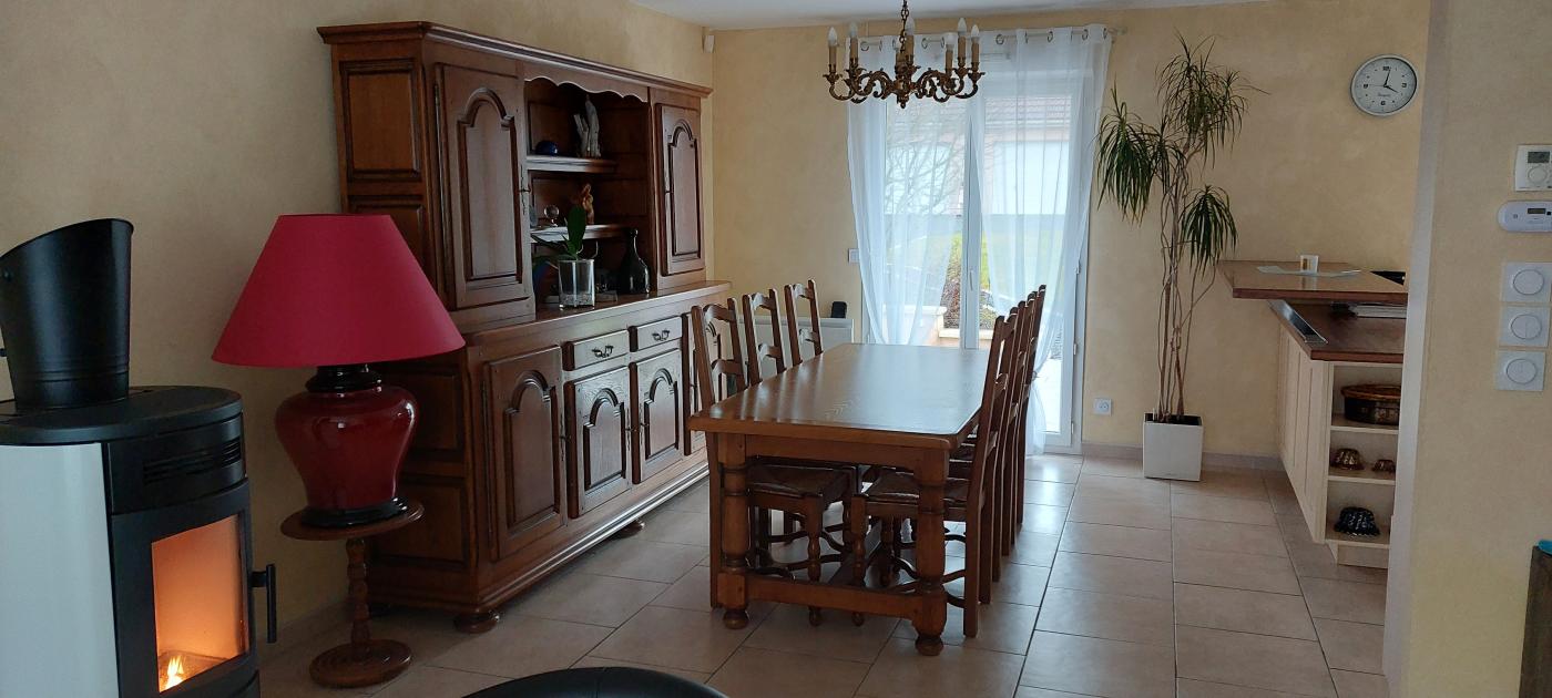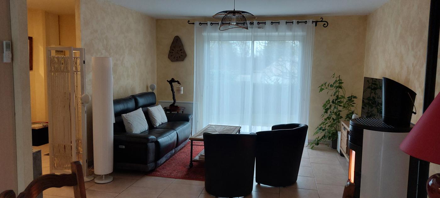 Séjour double lumineux équipé d'un poêle à granulés, ouvert sur une cuisine équipée donnant sur la terrasse avec store et barbecue.