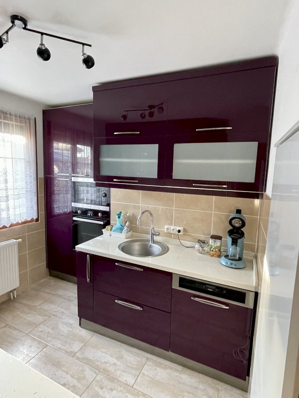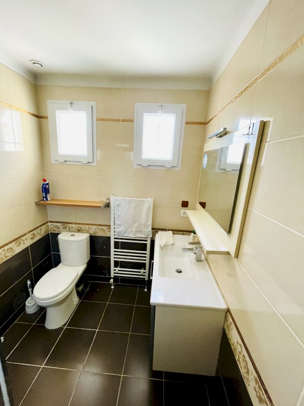 Accès par une tres grande terrasse carrelée et sécurisée par des barrières en fer forgé (20m²). Vous passez la porte d’entrée (sécurisée en métal) pour arriver dans une entrée avec placard (3,3m²) qui donne accès à une salle à manger et salon (22,81m²) et une cuisine moderne, tout équipée en électroménagers, avec beaucoup de rangements (9m²).