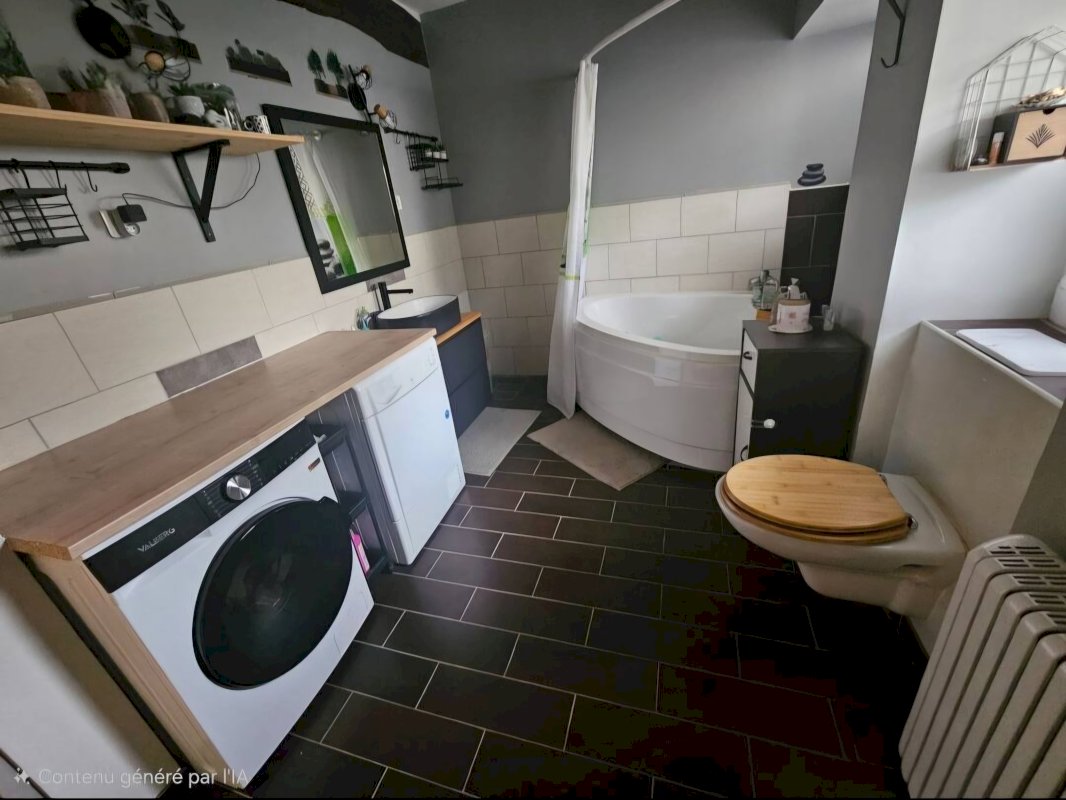 Une salle de bain rénovée en 2024 avec baignoire d’angle, WC et espace buanderie