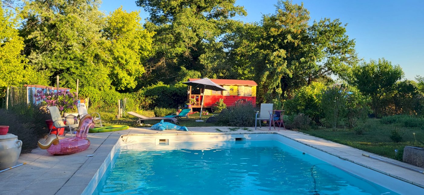 Jardin 1200 m², piscine 10x5, roulotte avec toilette sèche et Sdb pouvant faire du Airbnb. Coin repos près de la piscine. Grange et Garage.